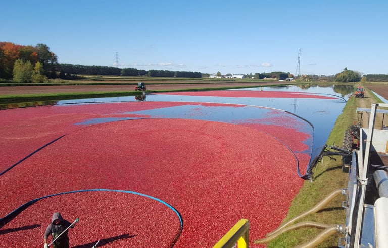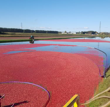 Les bassins de canneberges prêts à être récolter sont préalablement inondés afin que la batteuse puisse détacher les fruits du plant. Aussitôt que les canneberges sont détachées des plants, ces dernières flottent à la surface de l'eau. Les fruits sont par la suite amenés au système de pompage afin d'être recueillis. Les fruits récoltés sont par la suite transportés à notre usine de conditionnement.