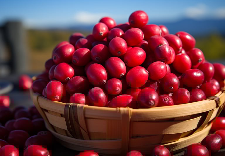 Les canneberges sont récoltées au mois d'octobre lorsque le fruit est d'un rouge intense et se prolonge en règle générale jusqu'au début novembre.